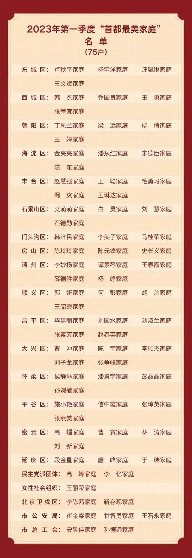 据悉,2023年寻找“首都最美家庭”活动以“激扬家国情 奋斗新征程”为主题,重点选树爱党爱国、绿色环保、科学教子、廉洁齐家、孝老爱亲、移风易俗等家庭典型,弘扬新时代家庭观,营造和谐和睦、向上向善的家风文化,以“小家”的文明共筑“大家”的和谐。