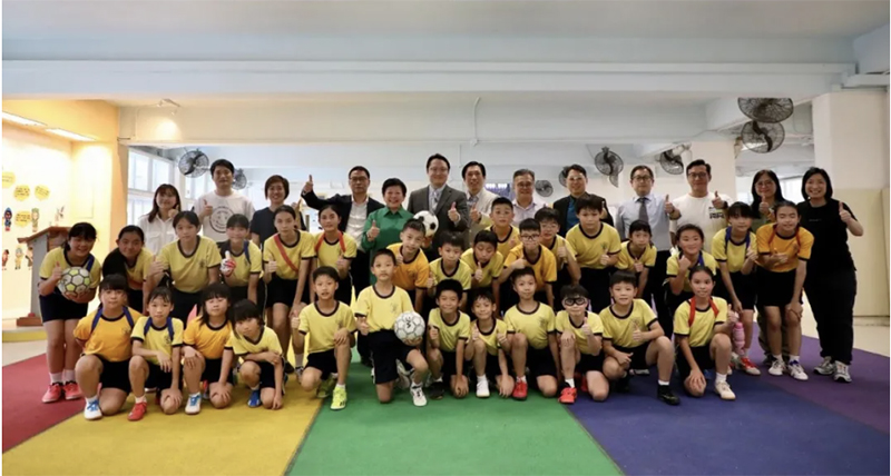 王琳达主席和香港观塘区学校校长们与足球训练课的孩子们共同合影留念