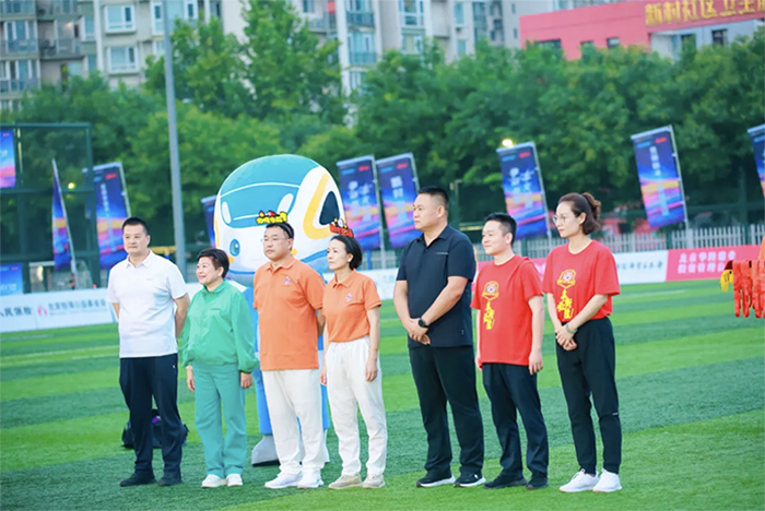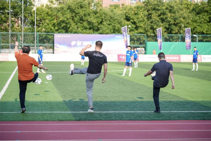 在赛事启幕之际,怡海集团总经理辛迪灏作为外资企业代表,与丰台区政府党组成员、副区长、新村街道党建工作协调委员会主任李国龙及集体经济组织代表华隆鼎业投资公司董事长安振辉,国企代表永乐文智园总经理黄玲海,北京市骐骥投资管理中心党总支副书记康福祥,私营企业代表利民菜市场总经理郑尚彬共同完成了意义非凡的开球仪式,为这场全民狂欢揭开了序幕。